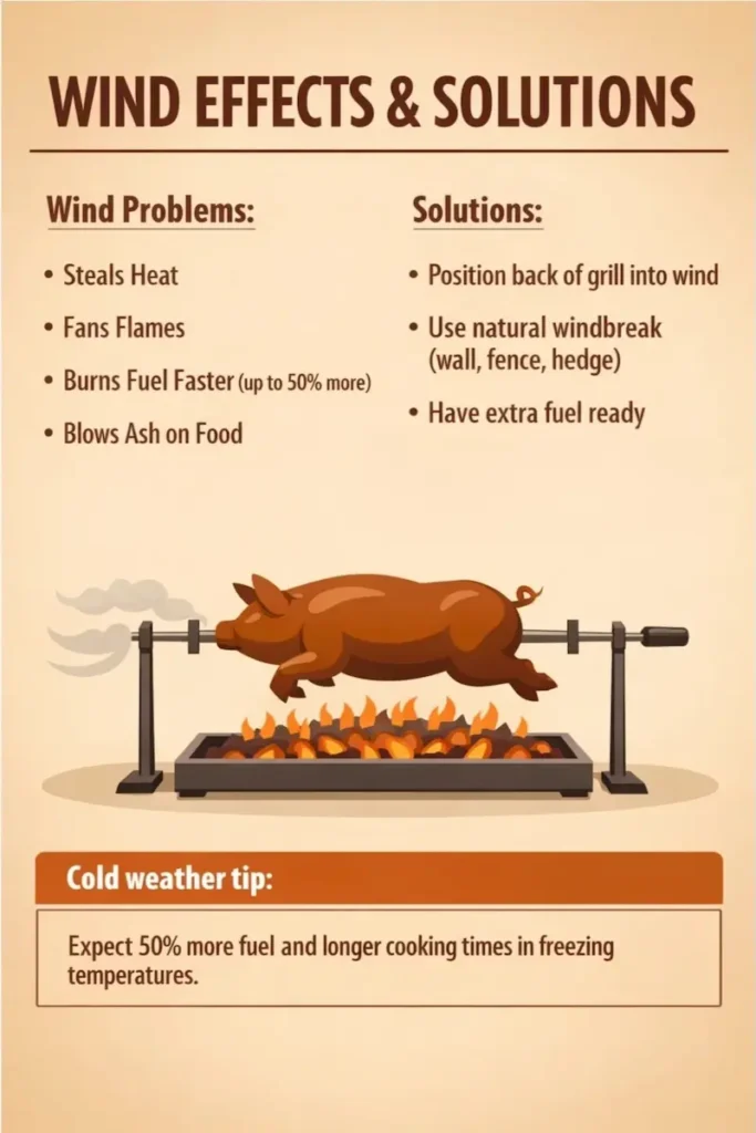 Wind is the number one enemy of a stable fire. It can steal heat, cause temperature